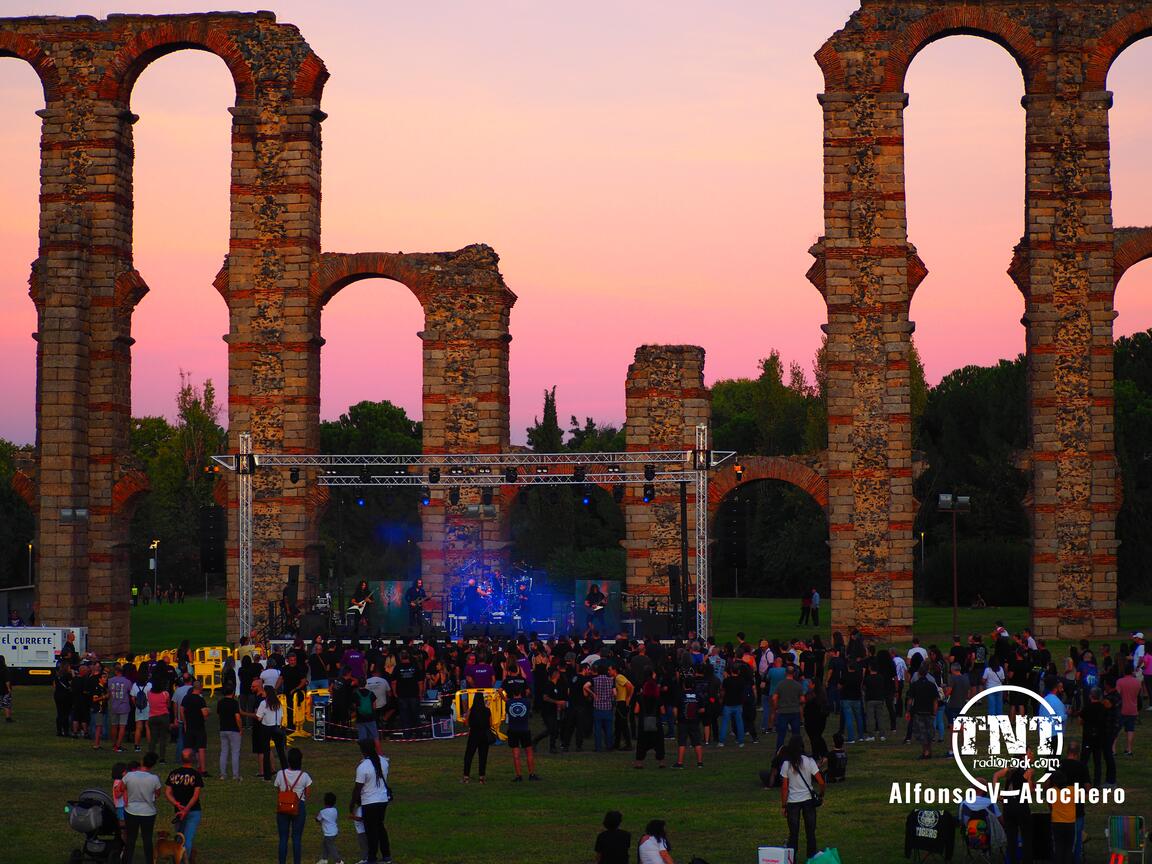 El Acerock es un evento con un formato mixto —entre festival y concurso— que, lejos de ser una rareza, ha encontrado su propio equilibrio. Tanto es así que este año ha alcanzado su séptima edición, consolidándose como una cita imprescindible para el rock y el metal extremeño. El festival se celebró en el Parque del Albarregas, con el majestuoso Acueducto de los Milagros como telón de fondo, un escenario incomparable que aporta a la música un aire casi ceremonial.