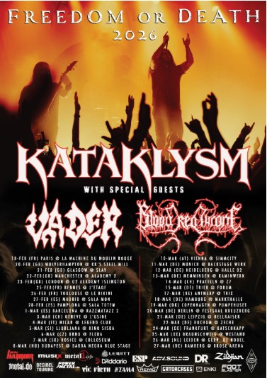 KATAKLYSM anuncia su regreso a los escenarios europeos con la gira “Freedom Or Death”, una extensa ruta de 32 fechas que tendrá lugar en 2026. Les acompañarán VADER y BLOOD RED THRONE, dos referentes del death metal europeo. Las entradas ya están disponibles en: https://linktr.ee/KataklysmTour2026.