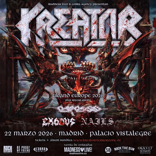 El domingo 22 de marzo de 2026, Madrid se convertirá en epicentro del metal extremo con una noche única en Vistalegre Arena. La velada reunirá a cuatro referencias absolutas del género: Kreator, Carcass, Exodus y Nails. Las entradas saldrán a la venta el 29 de septiembre a las 10:00 en madnesslive.es.